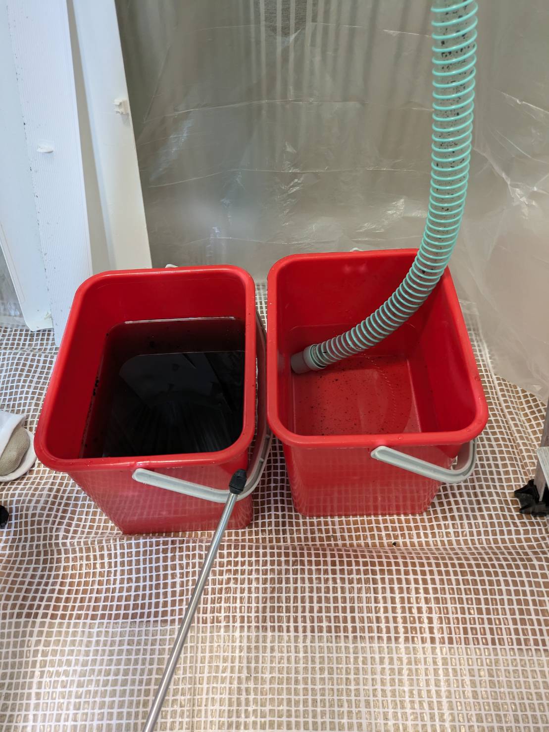 今回の業者さんは2回洗浄を売りの1つにしており、1回目の洗浄では左側のバケツのとおり真っ黒で、2回目はだいぶきれいになったことが分かります。