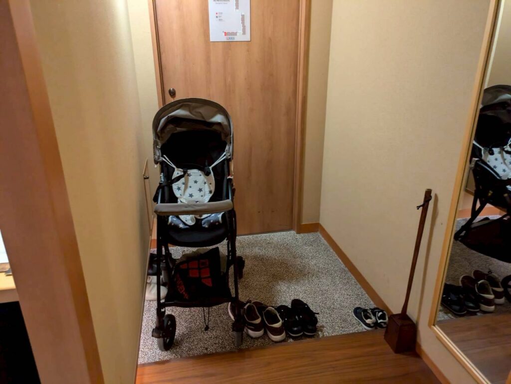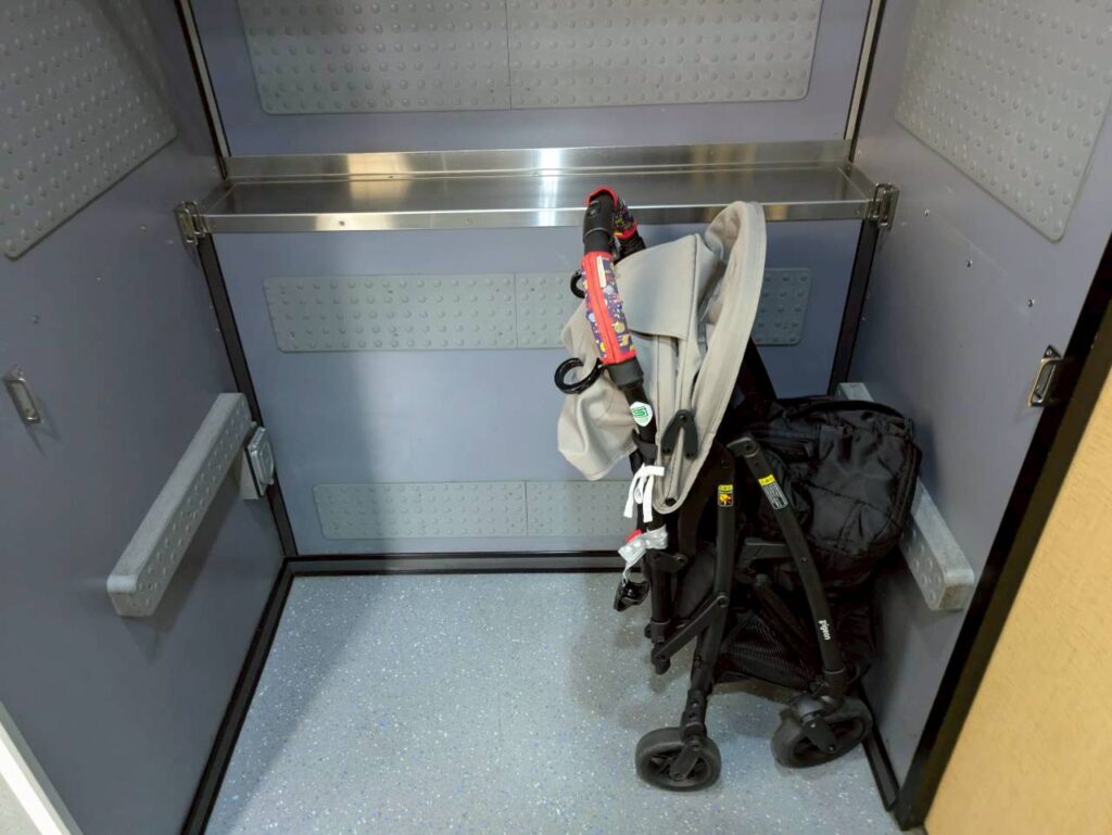ちなみにですが、車両と車両の間にちゃんと荷物置き場があり、ベビーカーを置くことができます。混雑時はすでに埋まっていることもあるかもしれませんが、私たちが行った8月の土日の場合、席自体が結構すいていたので、荷物置き場も実質貸切状態でした。