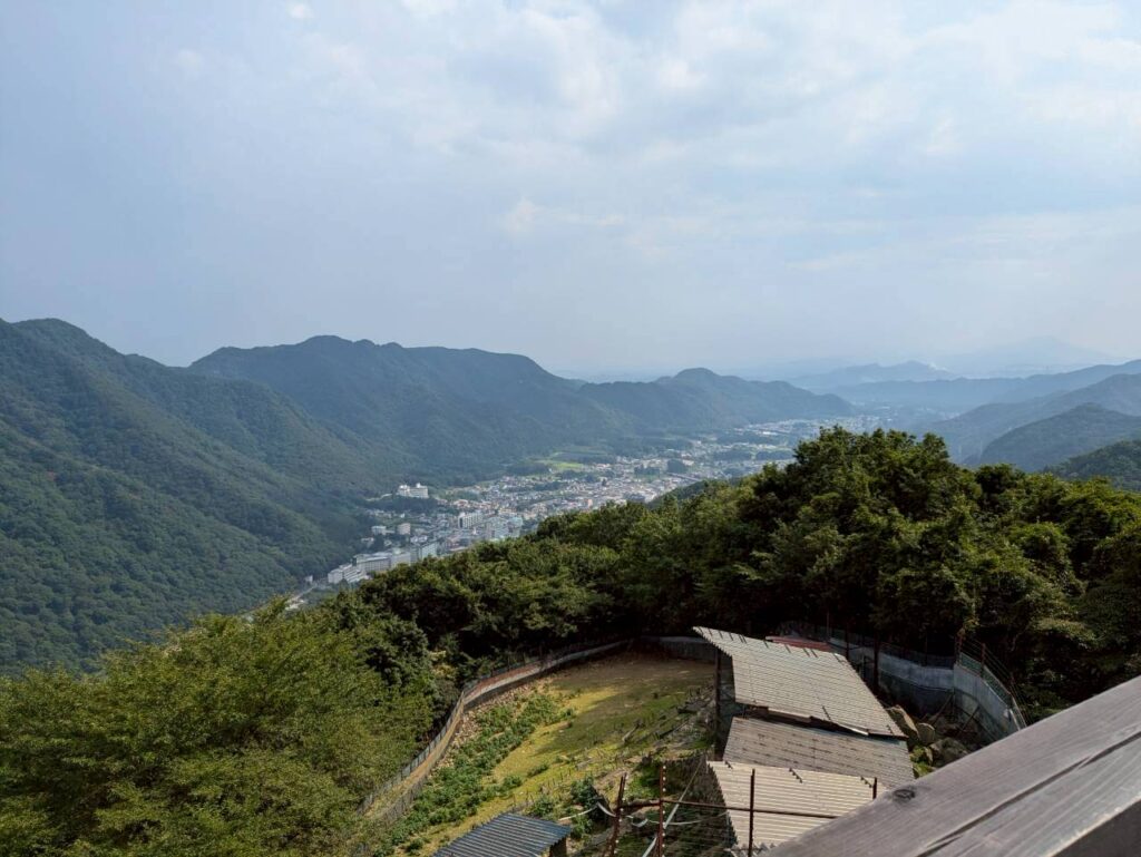 ロープウエイは子どもも大喜び、山頂まではすぐでとても景色がよかったです。山頂についてすぐのところにはおさるの山があり、フェンス越しにお猿さんに餌やり体験ができます。