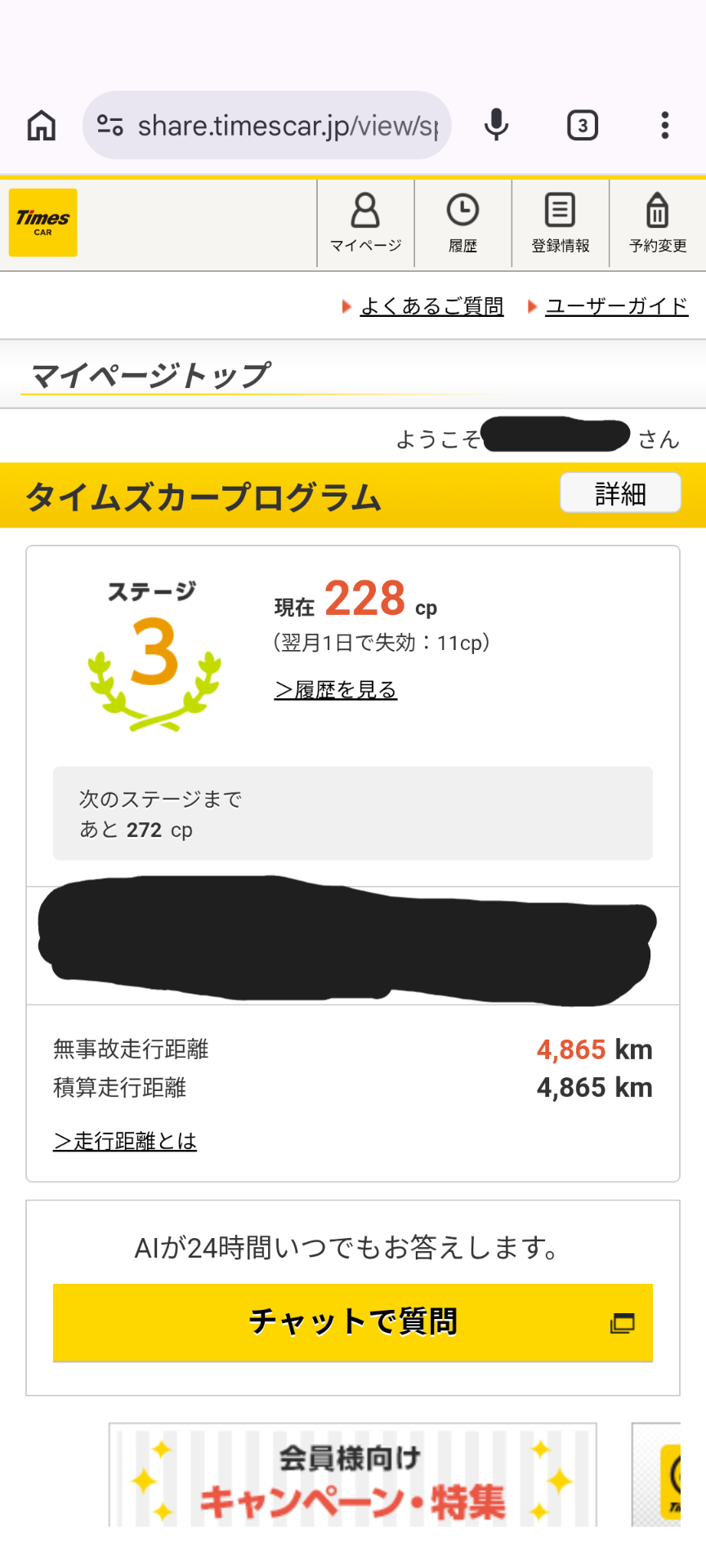 100cp獲得後約1年間は最悪カーシェアを利用しなくとも、月額基本料金は無料となるステージ2がキープされます。