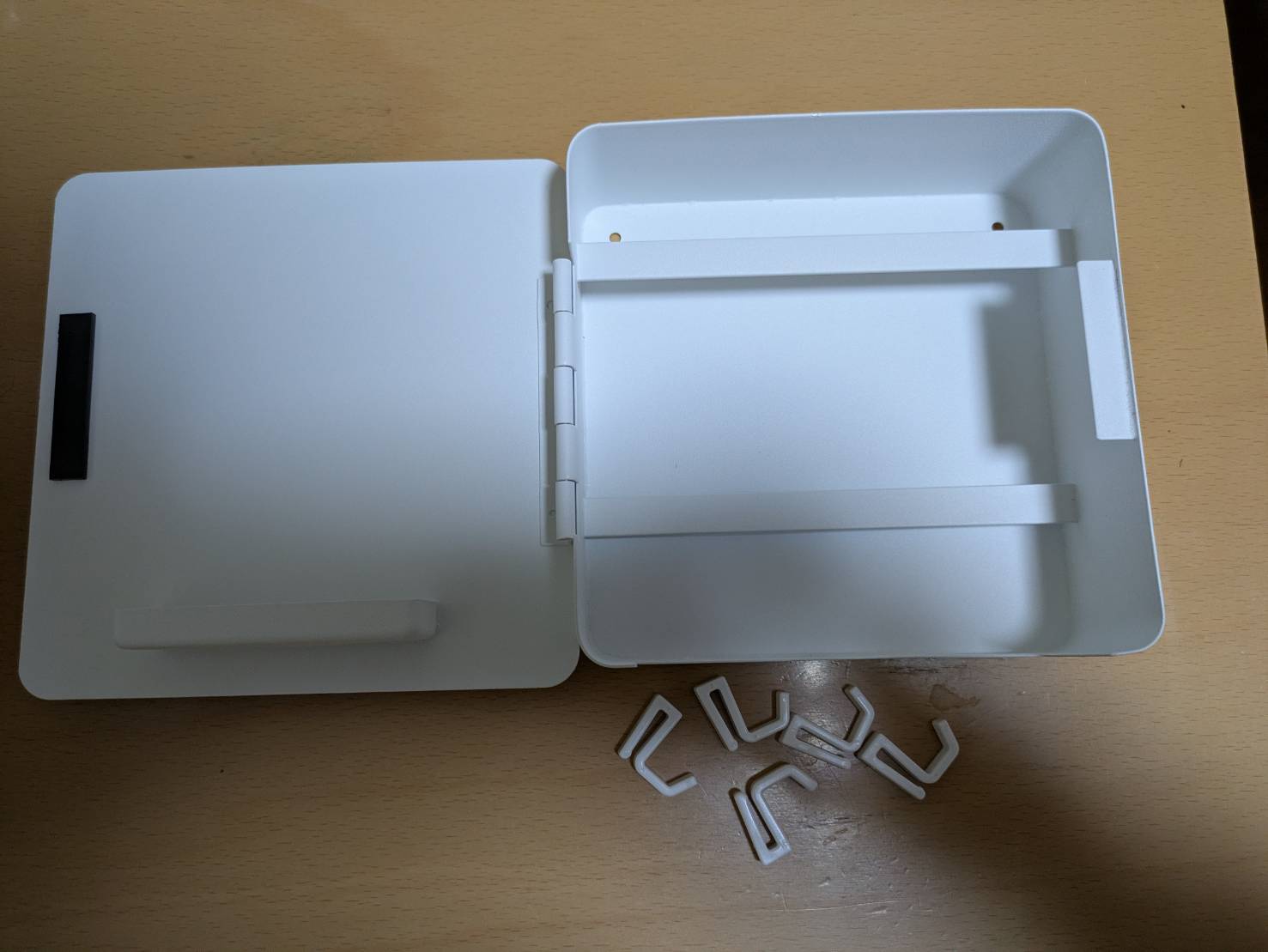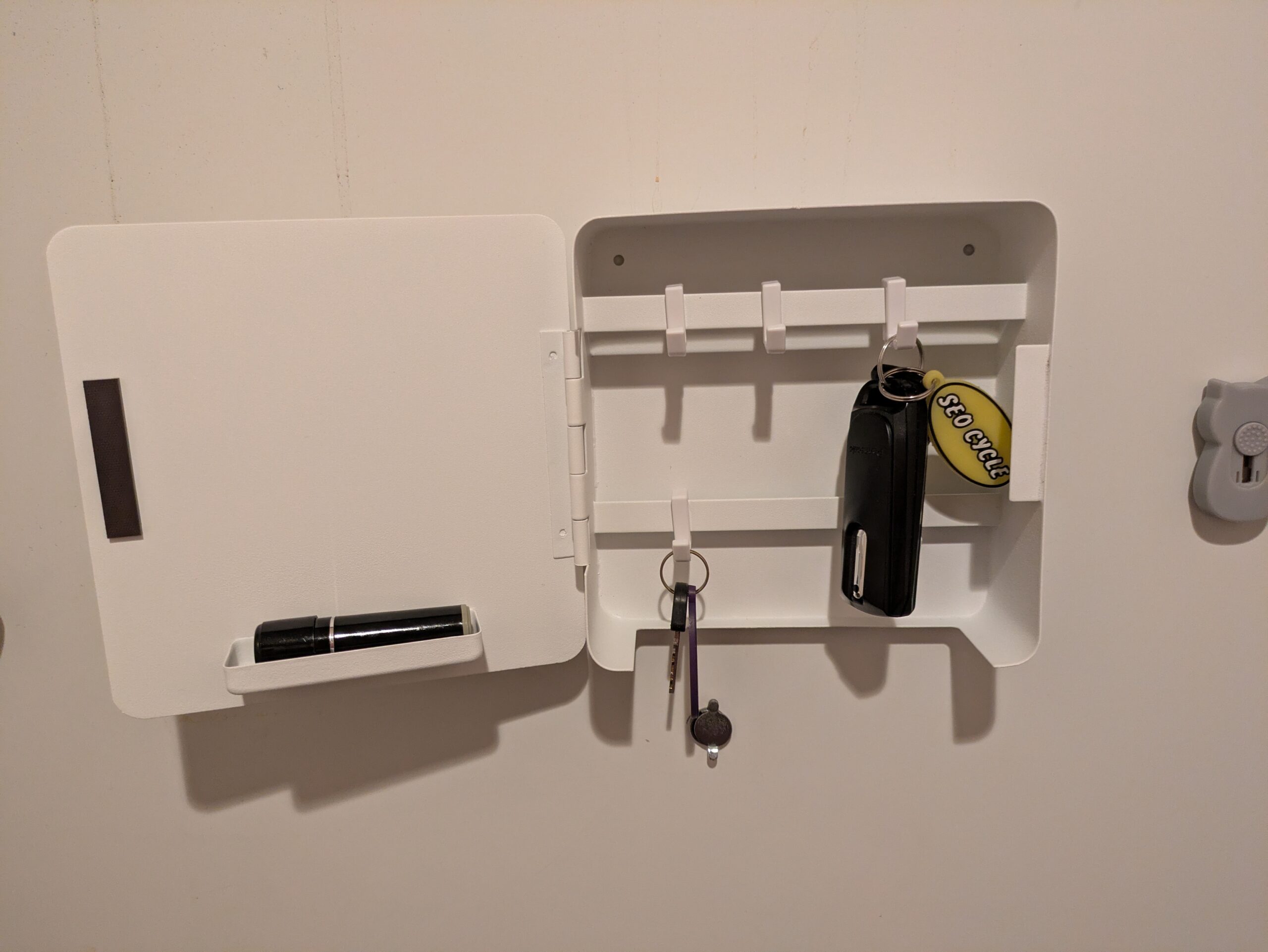 - 大きなキーホルダーがついている場合は、ハンコ置き場が干渉してしまうので、ボックス扉がひっかかることがある。(上段のフックにひっかけるようにすれば大丈夫になるかも)