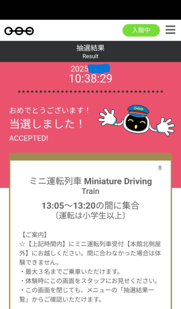 鉄道博物館では、人気コンテンツを体験するために抽選アプリを使います。 運転シミュレーターなどは抽選制で、当選しないと体験できません。