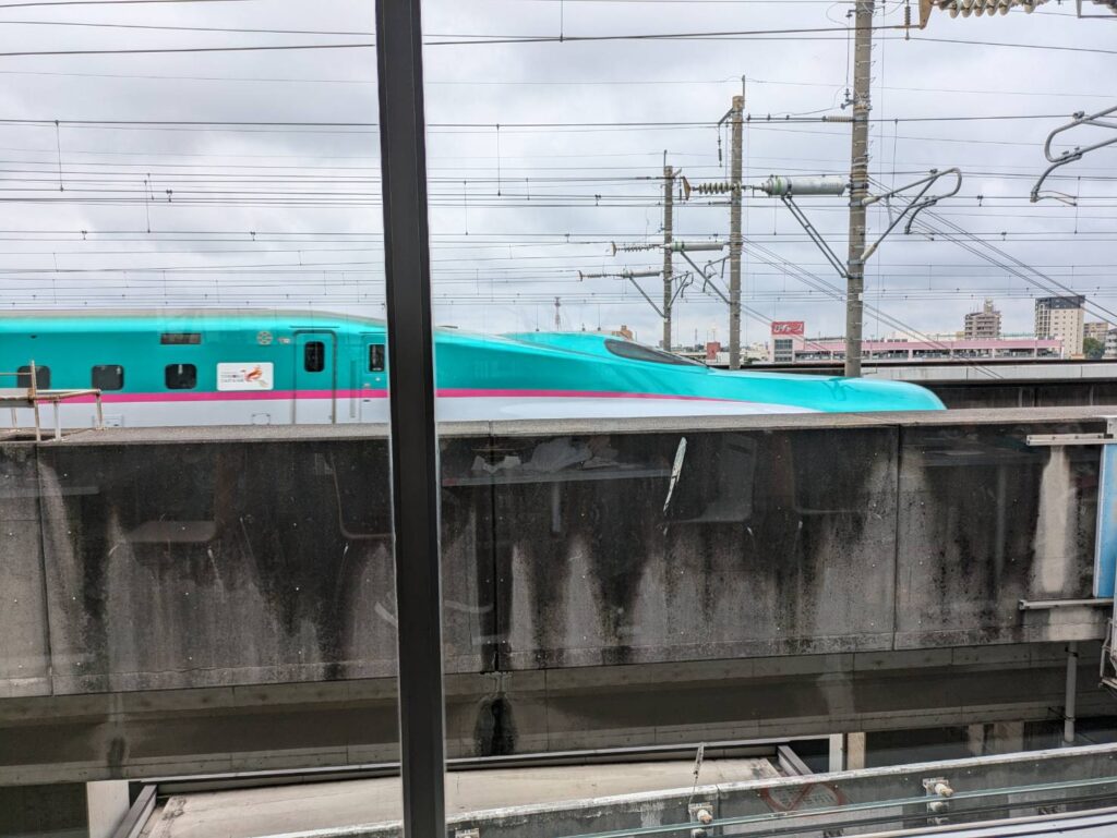 新幹線が一番よく見える窓際は埋まっていたのですが、幸いにもすぐに空いたため、間近で新幹線を見ることができました。