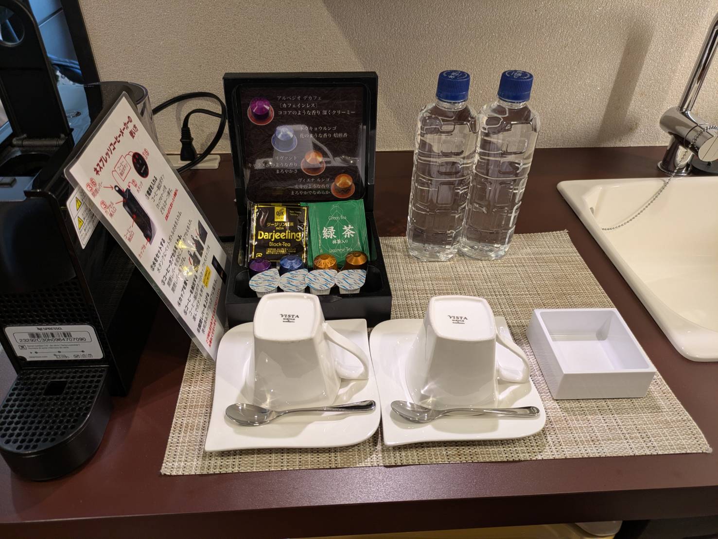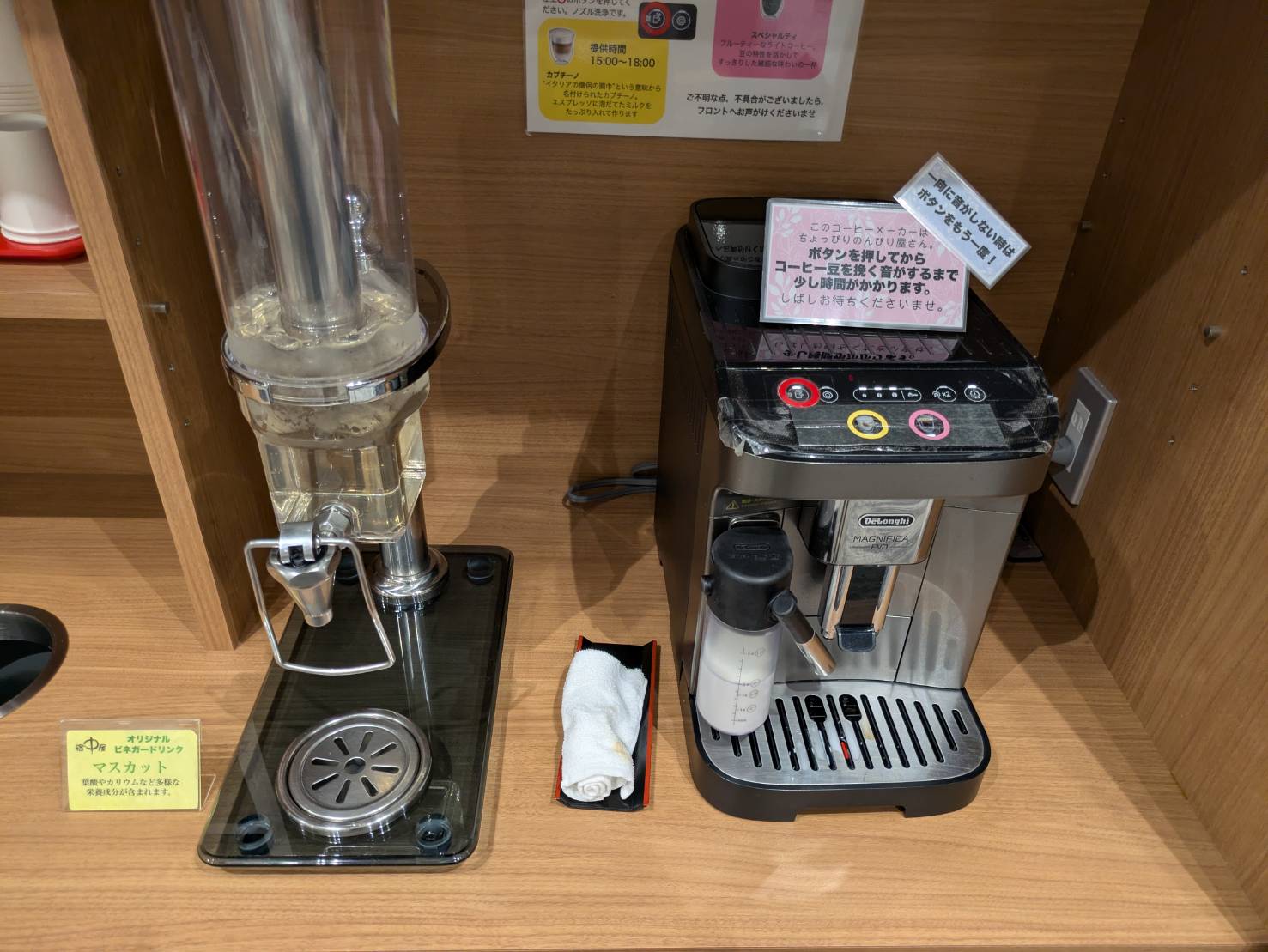 また、エスプレッソマシンや常温の水も無料です。地味にありがたいです。