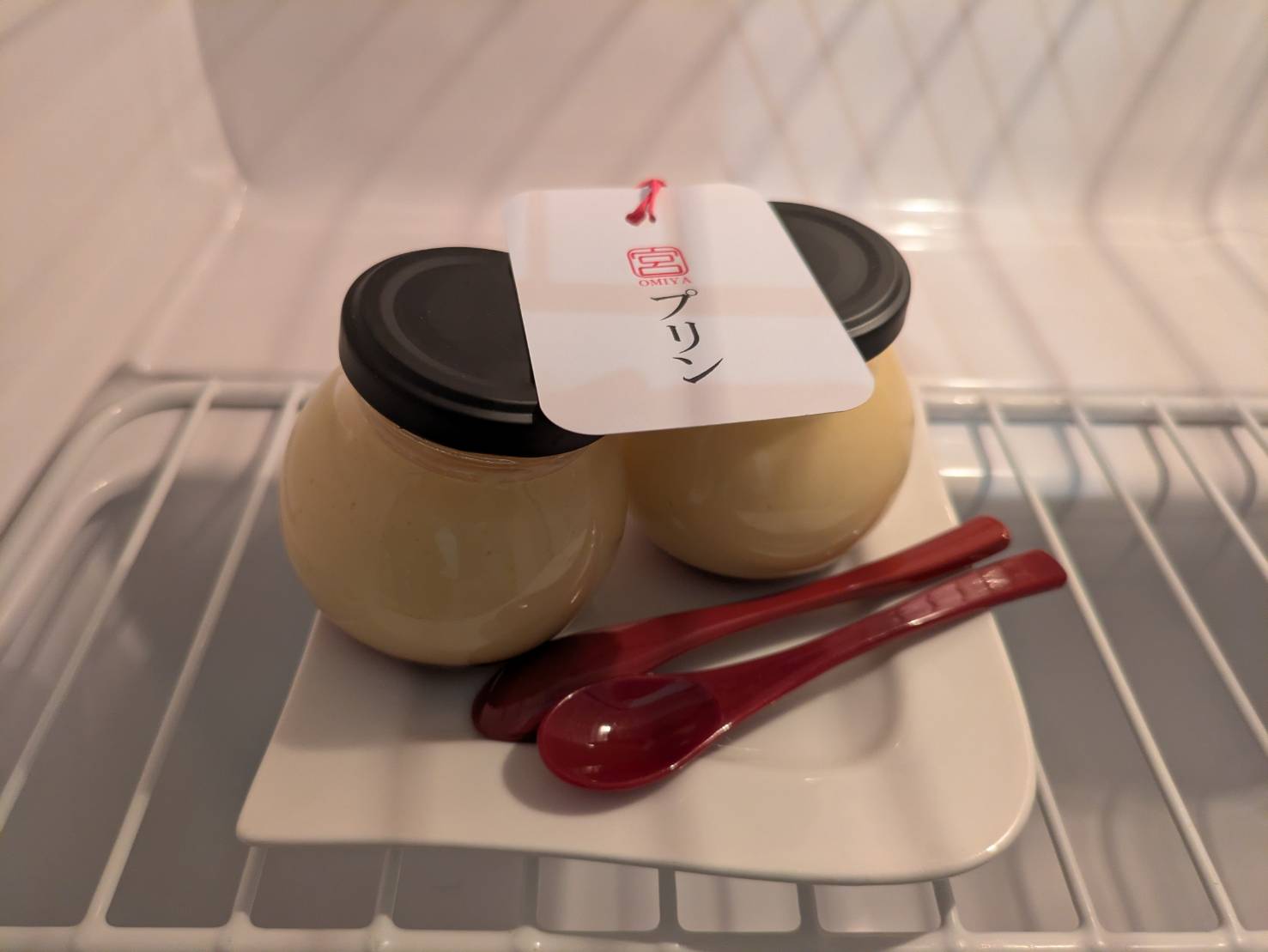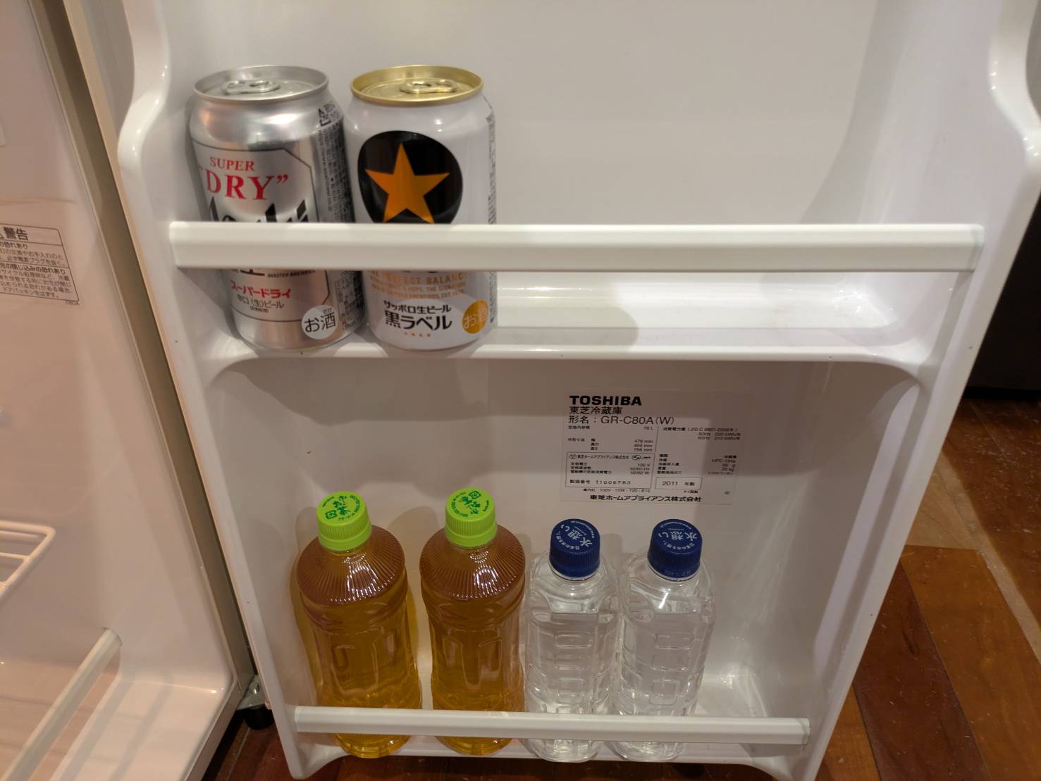 そして気になっていたフリードリンクの冷蔵庫の中身はこちら。なんと無料です(宿泊料金に含まれています)。プリンがあったのはびっくりです。
