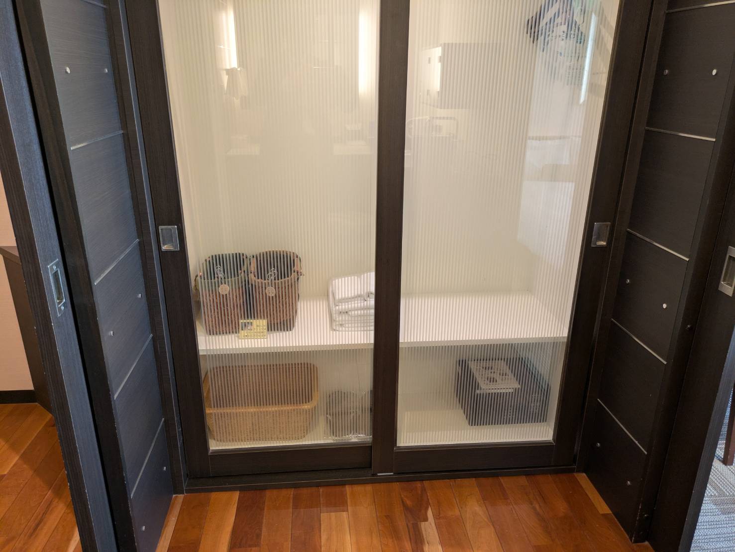 続いてクロークです。大浴場に持っていく用のかご、ハンガー、金庫があります。